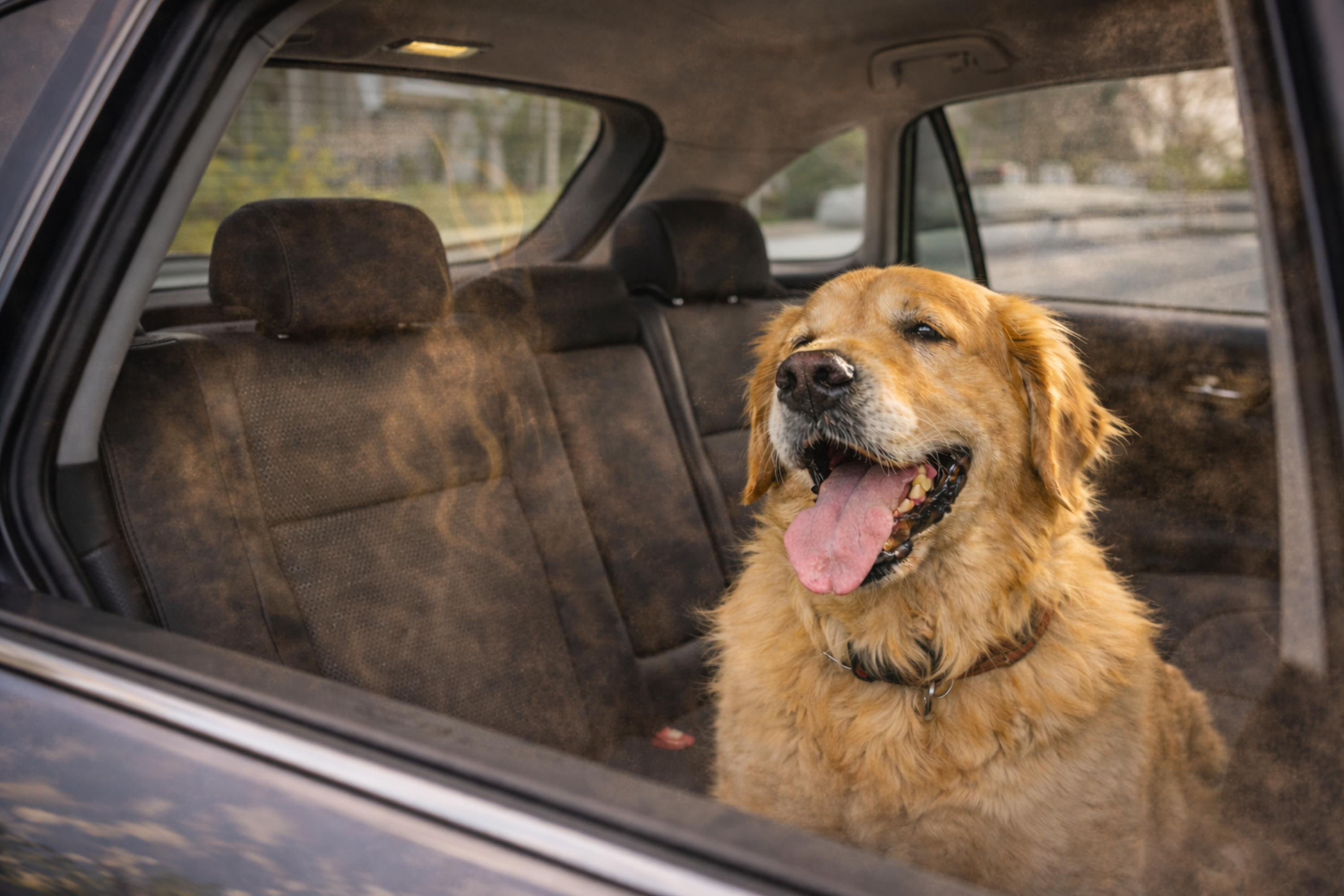 KI-generiertes Bild zum Thema "Todesfalle Auto" - hechelnder Hund im Auto mit Thermometer