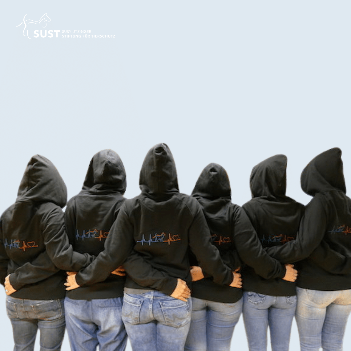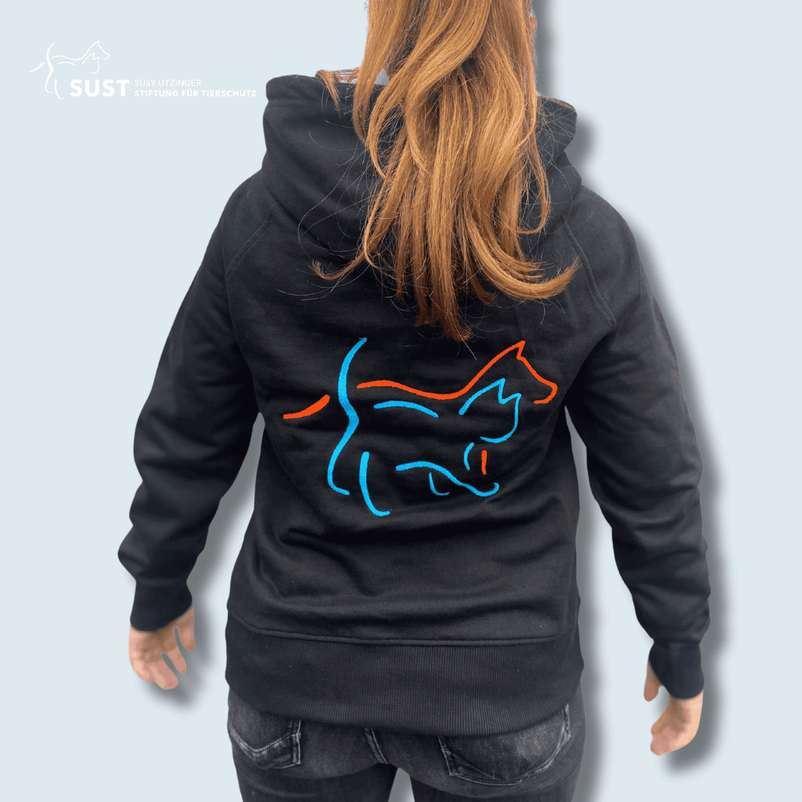 Bequemer Kapuzen-Pulli für Damen und Herren mit kleinem aufgesticktem SUST-Logo auf der Brust und SUST-Herzschlag auf dem Rücken. Farbe Pulli: schwarz, Farbe Stickerei: blau/orange